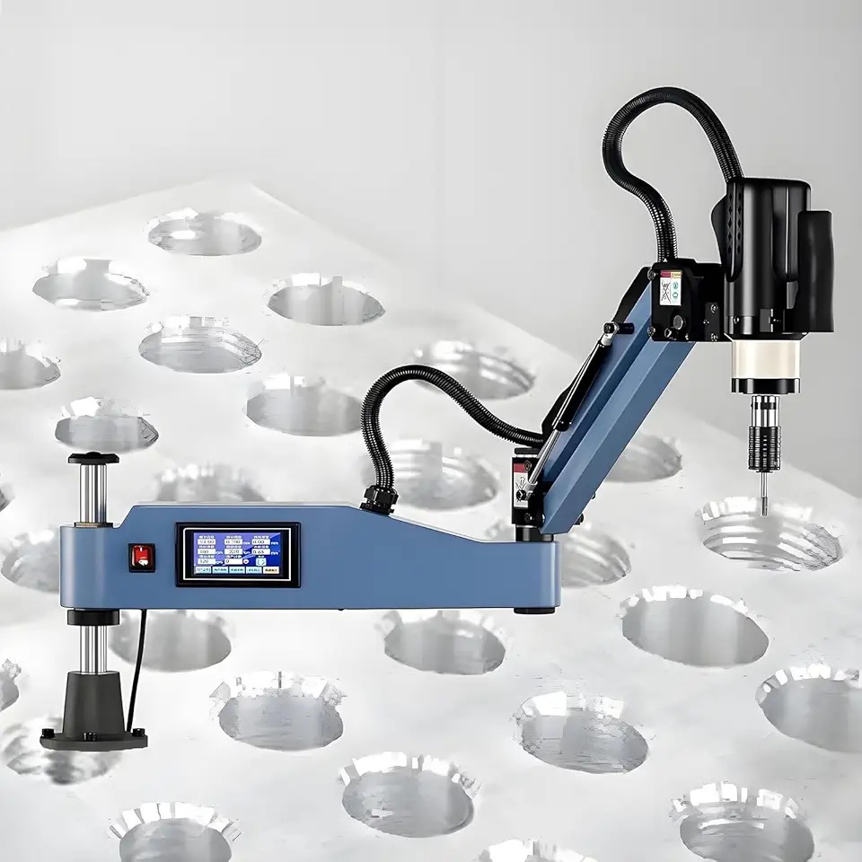 I use the HYUIO Electric Tapping Machine in my small metal shop and it's impressive for the price. The 600W motor handles M6-M20 taps smoothly, touch screen makes speed and depth easy to set, and the flex arm reaches awkward spots without hassle. Vertical mode is great for precision work. No chatter or stripping on aluminum or steel. A real time-saver compared to hand tapping – solid build too.
